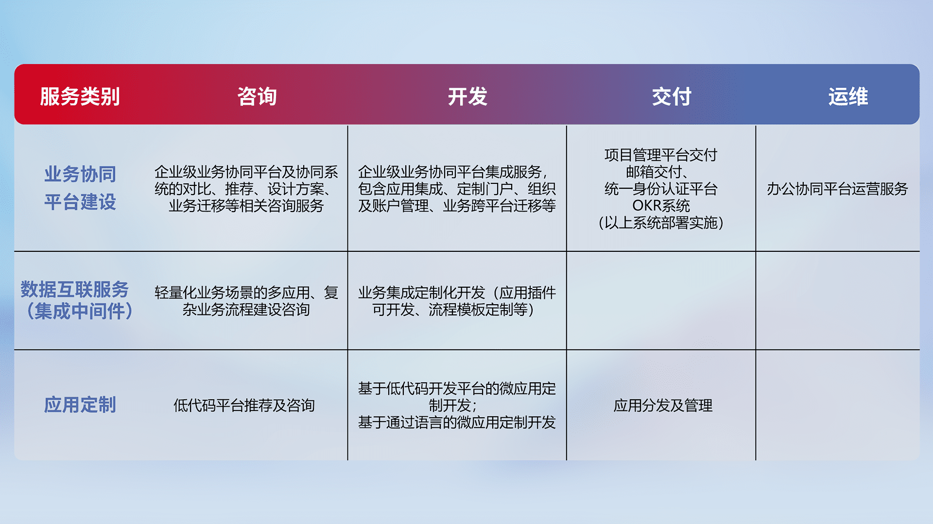 针对钉钉、、、企微、、、、IDaas等平台级产品提供产品的规划、、方案、、、、交付、、、定制化开发等服务,,,,实现如统一协同办公、、、、智能客户服务、、、、混合会议管理、、、智能数据查询、、、等业务场景,,,,实现数字化转型。。。。