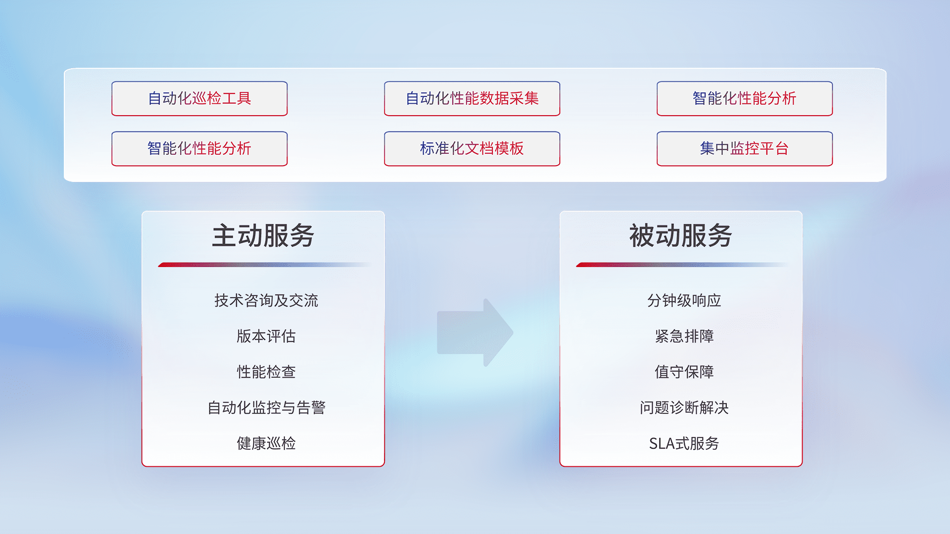 智能化工具和标准化文档,,,保障服务质量,,提供主动服务(包含技术咨询、、、版本评估、、性能检查、、、自动化监控与告警、、、健康巡检)和被动服务包含(分钟级响应、、、、紧急排障、、、值守保障、、问题诊断解决、、、、SLA服务)。。。。