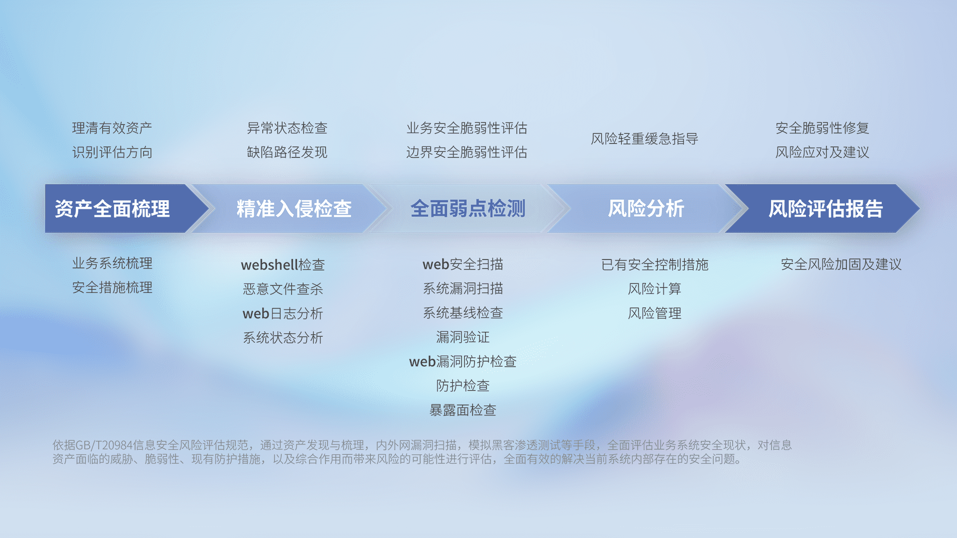 针对客户行业特性,,,以专业的安全服务+多厂商联合解决方案提供专属的一站式安全管理服务,,帮助客户全面感知网络空间威胁,,基于识别、、、、检测、、分析、、防护、、监测、、响应的服务理论模型,,,,从方案咨询、、集成交付、、评估验证、、优化加固、、、、运维运营,,致力于为客户提供完整的闭环管理式安全服务。。。以实战经验为客户打造高抵御风险的安全体系,,帮助客户发现威胁、、、、对抗威胁、、、、处置威胁,,,,不断积累安全对抗能力,,,,持续保障数字化安全。。。。
